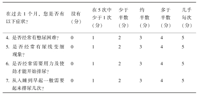按前列腺增生的大小分度,只能说明前列腺体积的增大程度,并不能表明增生的腺体对尿道的梗阻程度和疾病的严重程度。病史询问通常推荐使用国际前列腺症状评分(international prostate symptom score,IPSS)量表(表2-1),其是国际公认的判断前列腺增生症状严重程度的标准,也是患者下尿路症状严重程度的主观体现。IPSS量表虽不能用于确诊前列腺增生,但对客观评估症状的严重程度是一个理想的方法。