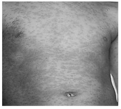 第二阶段(出疹期约3天):体温继续升高,可达40℃,皮疹开始出现(图11)。出疹首先在耳后发际部位,迅速发展到面颊部,尔后自上而下逐渐蔓延到胸部、背部、腹部及四肢,遍及全身,最后至手掌、足底(图12)。