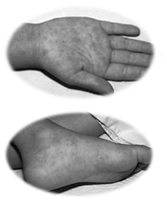 第三阶段(恢复期约3天):皮疹出齐后按出疹顺序再逐渐消失,最后会留有棕色的色素斑伴糠麸样脱屑。